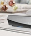 De stijlvolle behuizing van de HEOS Amp bevat elegante zilveren accenten en voor het gebruiksgemak zijn er subtiele volume- en dempknoppen op het zijpaneel geplaatst.