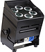 Door accu gevoede LED-projector, gebaseerd op 6 stuks 10 watt RGBWA-LED's om ongewenste kleurschaduw te vermijden.