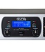 Het LCD-display toont: audio ingangsniveau, netspanning, werktemperatuur en ventilatorsnelheid.